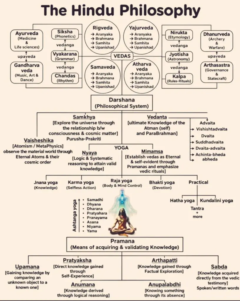 Die hier dargestellte Struktur zeigt, wie die hinduistische Philosophie aufgebaut ist. Im Zentrum stehen die Veden. Daraus entwickeln sich weitere Wissensbereiche, philosophische Schulen, Yoga-Wege und Methoden zur Erkenntnisgewinnung. Alles ist miteinander verbunden. Deshalb sollte man das System nicht als lose Sammlung einzelner Ideen verstehen, sondern als ein organisches Ganzes.